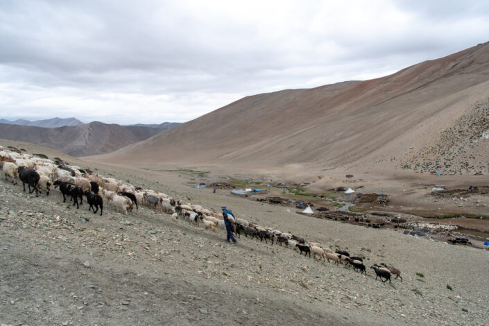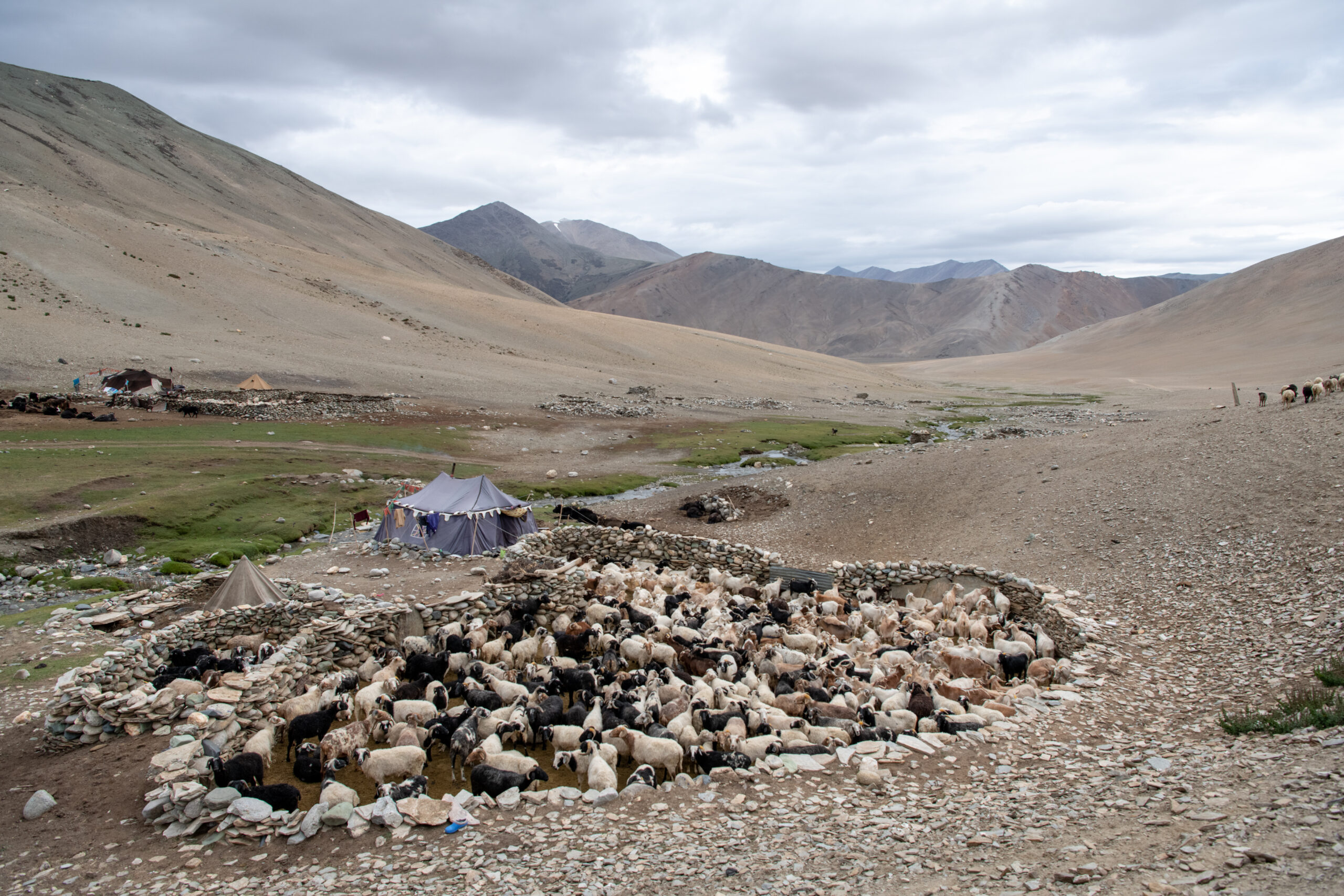Nous arrivons au creux d’une vallée. Une vingtaine de tentes enlacent de part et d’autre un cours d’eau. Des yacks pâturent en liberté. La vingtaine de familles qui habitent les lieux possèdent plusieurs centaines de têtes de bétail. Les moutons et chèvres, entassés dans des enclos fermés par des murets en pierres, portent chacun une tache bleue, rouge, rose ou verte… le troupeau porte la couleur de la famille à laquelle il appartient. Sans eau courante ni électricité, trouvant abri sous des tentes en laine chauffées à la bouse de yack séchée, les nomades ont la vie dure.