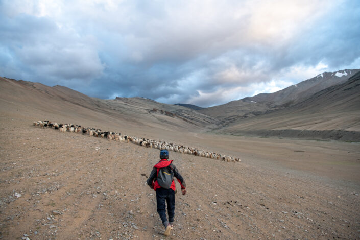 De 3500 mètres d’altitude de Leh, nous recommençons à monter. Nous franchissons le col de Tanglang qui culmine à plus de 5300 mètres. Sur ce chemin de haute montagne, nous croisons, parmi les travailleurs qui réparent la route, quelques femmes assises par terre qui, pendant leur pause, filent la laine pashmina brute autour d’une bobine en métal. La laine est la première source de revenus des populations du Changtang. Depuis les bergers qui partent avec les chèvres sur les pâturages de hautes montagnes jusqu’aux femmes assises sur le bord de la route, tout le monde participe à l’activité.