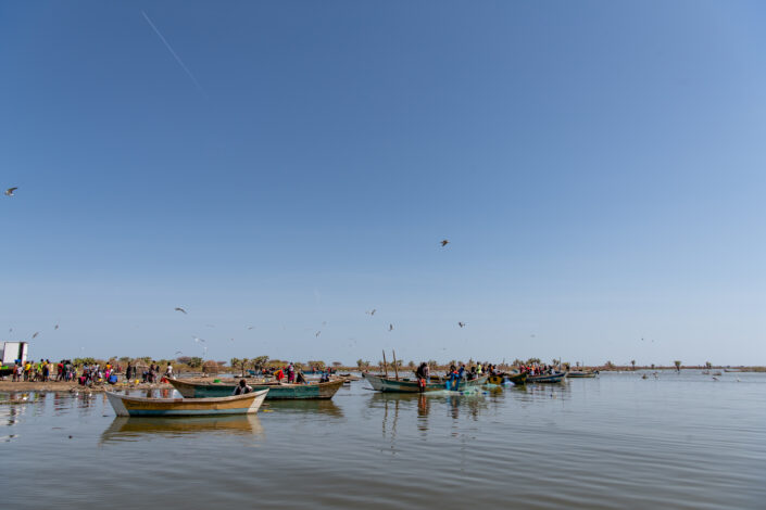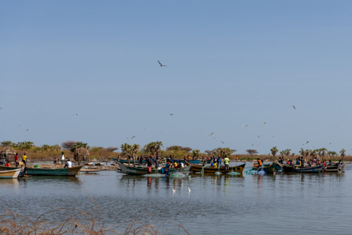 Les fluctuations du niveau de l’eau du lac induites par la construction d’un barrage dans l’Éthiopie voisine ont dramatiquement changé la géographie du lac. L’eau est montée de plusieurs mètres par endroits, engloutissant des villages entiers et forçant les populations à se déplacer plus au sud. Le village de Kalokol, encore inexistant il y a deux ans, accueille ces déplacés venus de tout le pourtour du lac. En un temps records, ce petit amas de terre désertique est devenu un point névralgique du commerce de poisson à travers la région et le pays.
